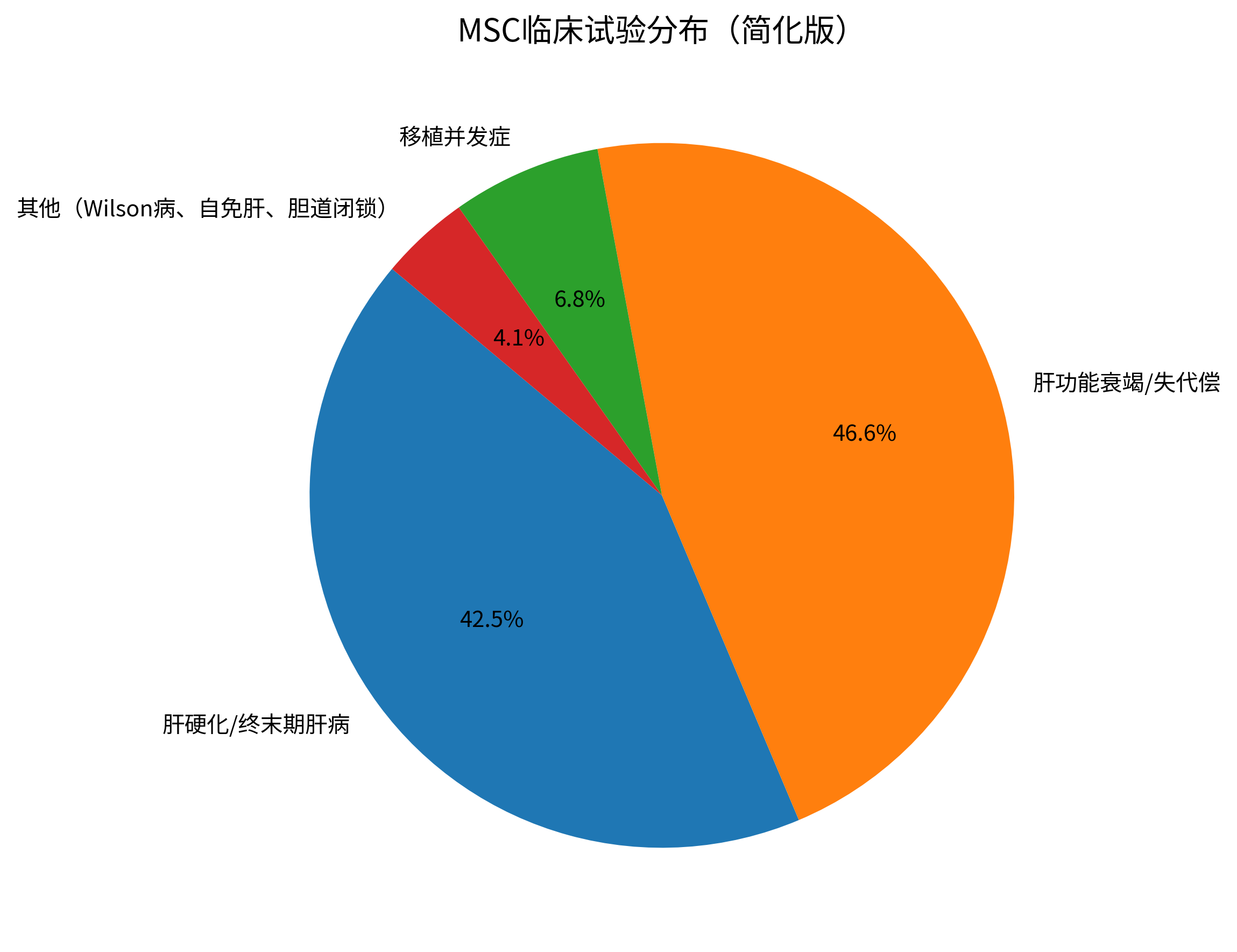 截至 2024 年,已有 70 多项 MSC 治疗肝病的临床试验被登记。这些试验覆盖肝硬化、肝功能衰竭及移植并发症等疾病。其中大多数集中在脐带来源的 MSCs,其次为骨髓来源 MSCs,用于治疗终末期肝病。